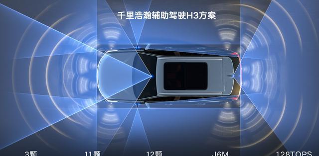 小蓝灯版的核心升级在于智能驾驶,它搭载了“千里浩瀚辅助驾驶H3方案”,硬件上配备了3颗毫米波雷达、11颗高感知摄像头和128TOPS算力的芯片,支持高速NOA领航辅助驾驶,可实现自动变道、超车、进出匝道、多场景智能泊车辅助等。